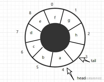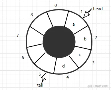 从上图我们可以看出这是一个大小为9,head=1,tail=5的队列,再有数据入队时,将会放到下标为5的位置,tail+1,但是当tail=8时,如何处理呢?