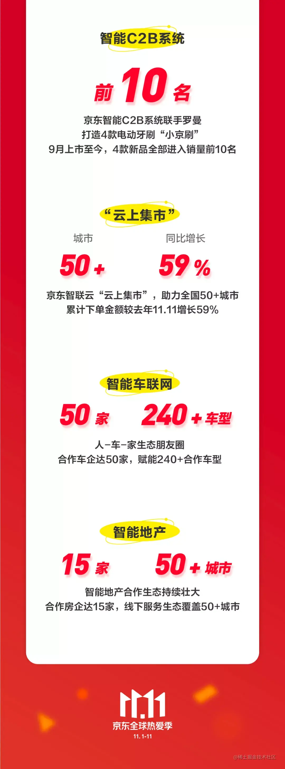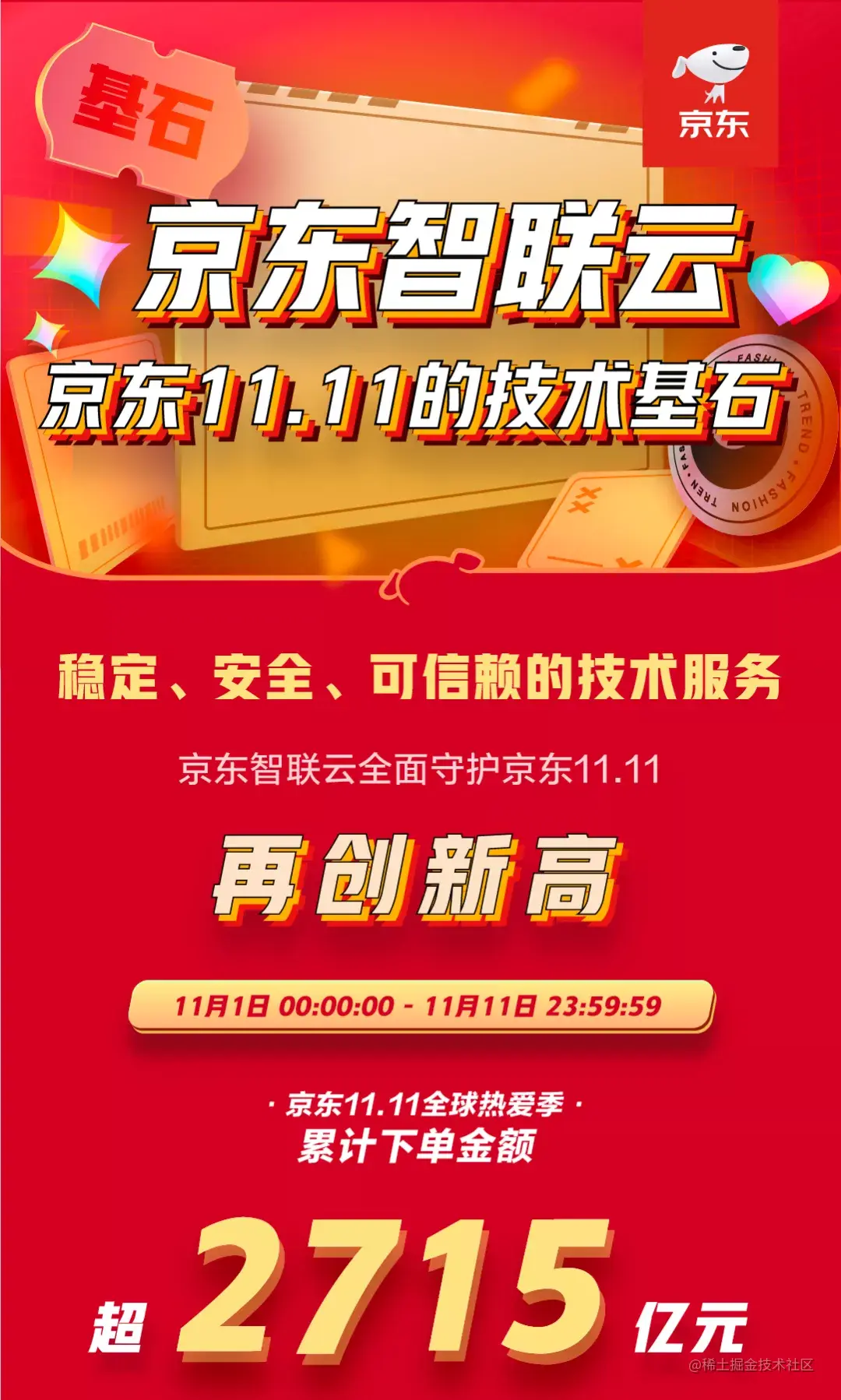创新高!截至11月12日凌晨,京东11.11全球热爱季累计下单金额超2715亿元,再次突破历史最高下单金额,实现完美收官!京东智联云发布11.11战报,以稳定、安全、可信赖的技术服务,全面守护下一个十年的首场京东11.11大促,是京东11.11坚实的技术基石。