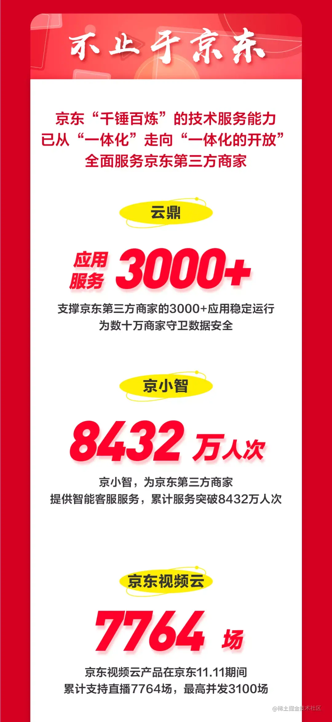 同时,多年大促锤炼了京东坚实的技术服务能力,京东智联云将其赋能行业,从“一体化”全面走向“一体化的开放”,驱动数字经济助力实体经济。11.11期间,零售应用云服务平台“云鼎”支撑京东面向第三方商家的3000+应用稳定运行;京东视频云产品累计支持直播7764场,最高并发3100场。京小智在11.11当日接待破547万人次,累计提供咨询与导购服务8432万人次,相比去年双十一提升200.02%。