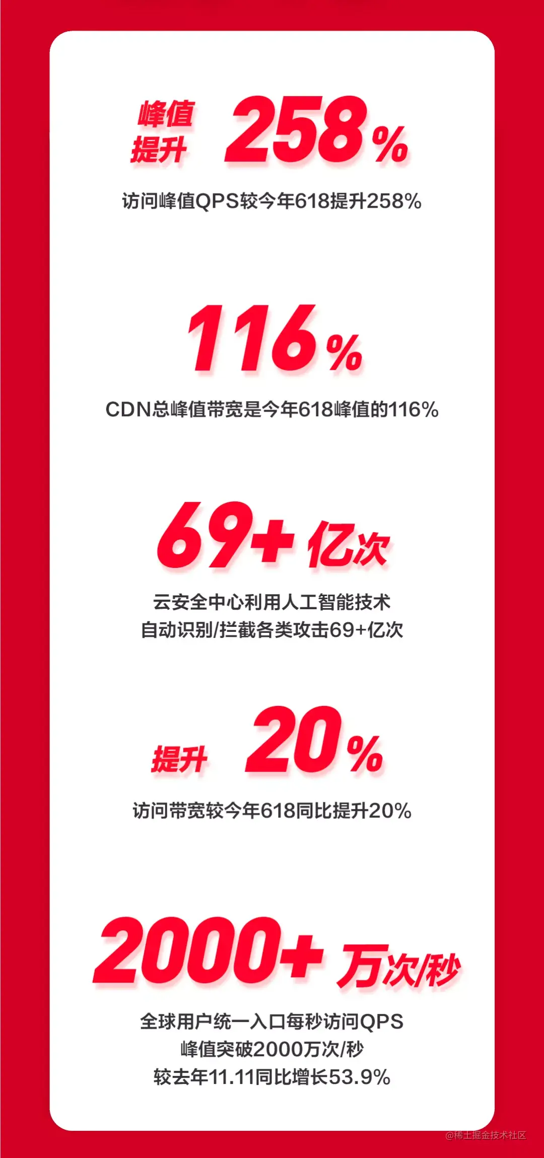 大促期间,京东智联云访问带宽较今年618同比提升20%,超高弹性应对京东11.11海量并发需求,访问峰值QPS较今年618同比提升258%;京东智联云CDN总峰值带宽是今年618峰值的116%;云安全中心自动识别/拦截各类攻击69+亿次,为京东11.11保驾护航;数据中心覆盖全球,用户统一入口访问QPS峰值突破2000+万次/秒,较去年11.11同比 QPS峰值增长53.9%。