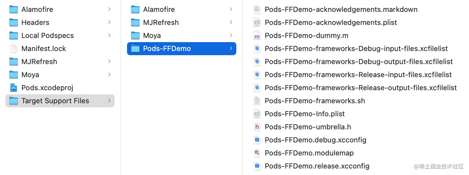 从目录看,除了pod init引入了Podfile,其余三部分内容:FFDemo.xcworkspace、Podfile.lock、Pods目录都是由pod install之后生成的。我们下面重点讲下这三部分内容。