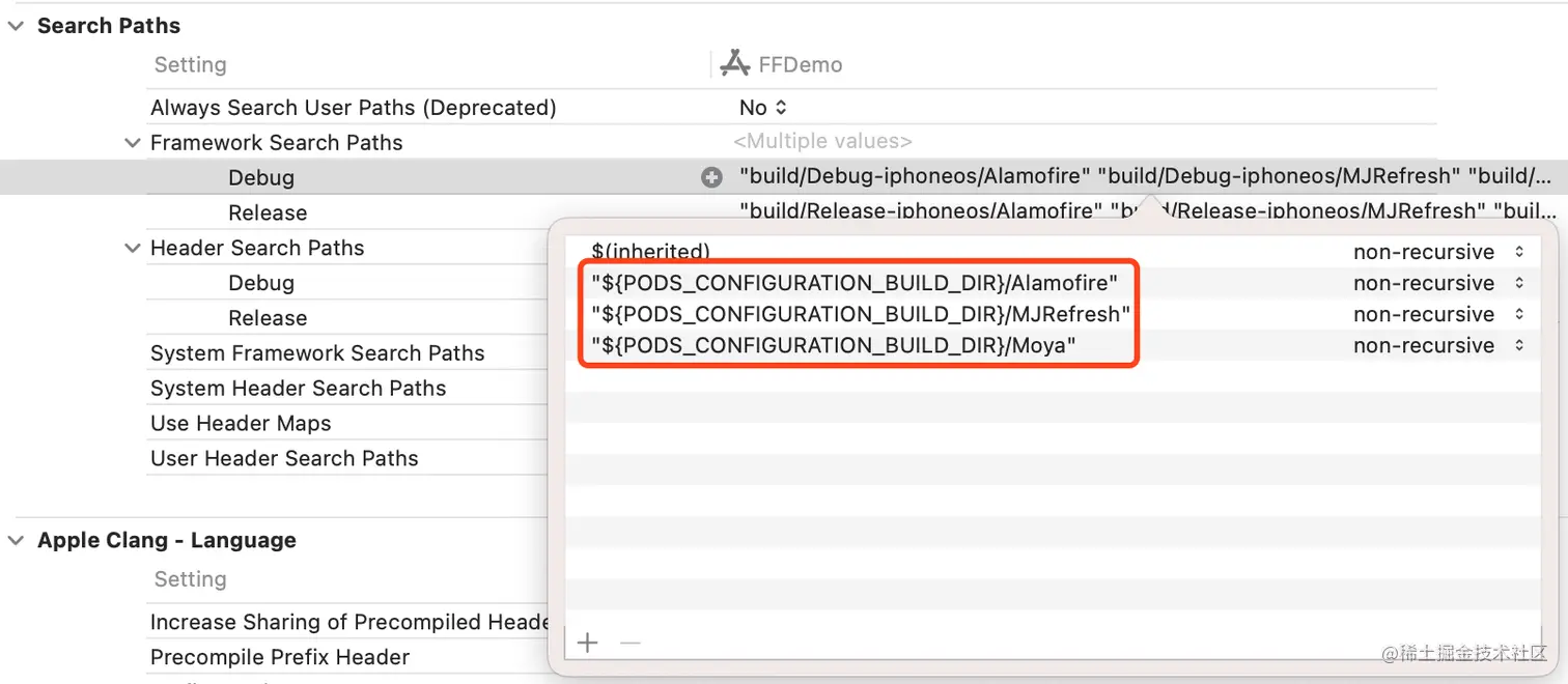 xcconfig还有个作用是设置参数,比如我们比较熟悉的PODS_ROOT=${SRCROOT}/PODS,它代表项目根目录下的PODS文件目录。另外两项用于帮助我们在项目中查找三方库的FRAMEWORK_SEARCH_PATHS和HEADER_SEARCH_PATHS也是在改文件内部定义的,这些配置会体现到Build Settings里面: