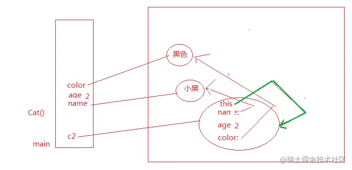 4 构造方法在什么时候调用 Cat c = new Cat(); 1)在栈中创建c变量 2)在堆中分分配对象内存 3)调用该对象的构造方法 4)默认初始该对象成员变量,对象创建成功。 5)把对象地址赋值给c变量