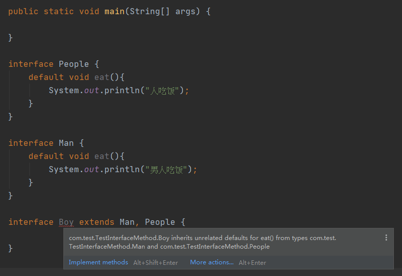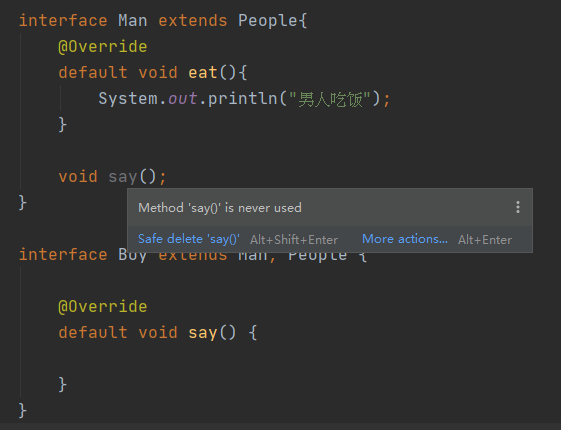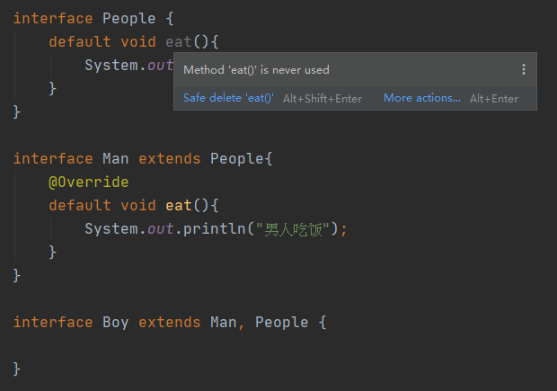 这就是接口多继承带来的冲突问题,Boy 不知道该继承谁的,这显然也是个问题,IDEA 也会提示,需要重写这个方法才能解决问题: