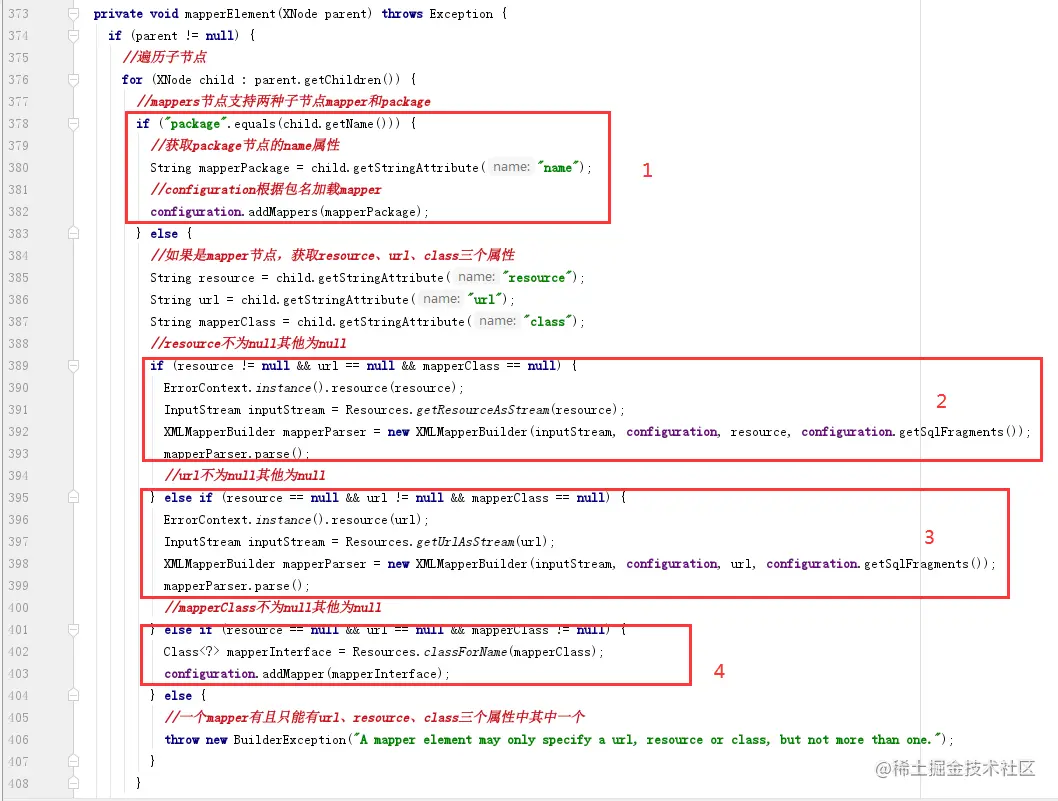 mapperElement解析两种mappers子节点,主要代码我分成了4个部分,接下来逐一进行深入解析。
