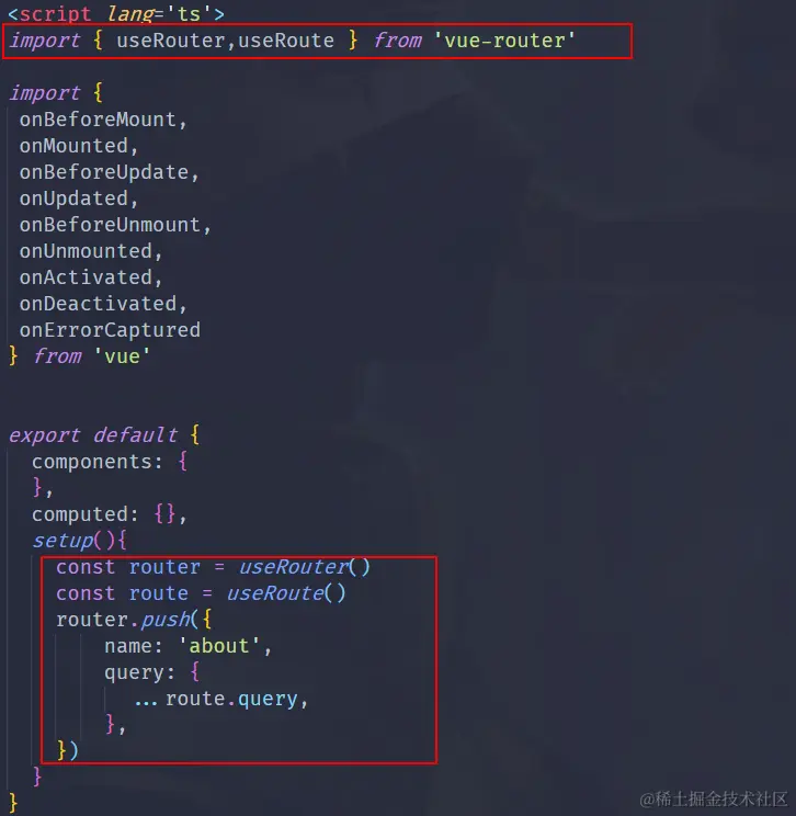 这里只需要调用对应的userRouter函数就可以了,注意要在上方import引入,在setup里面不用return返回。(这里没有贴代码,自己手动敲一下感受编程的快乐🤣)