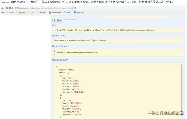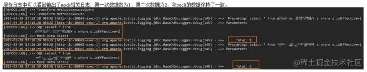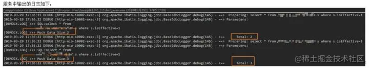 再次运行上面的代码,执行结果如下,输出了DBMock相关的log信息,返回的数据正好为上面mock的数据,并且两次sql语句虽然相同,但是返回的结果数据是按照mock文件里的顺序返回的。