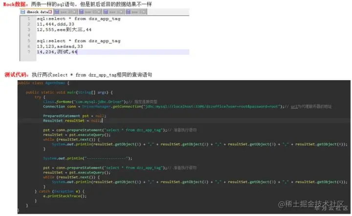 Mock数据设计和解析:一次请求链路中,比如有下面三次查询语句,并且存在相同sql执行多次并且返回结果不同的情况,那么我们在回放请求过程时,就得按顺序去依次取得每条sql执行的结果数据,而且能做到可对链路中其中一些sql结果进行mock,不mock的sql返回数据库的真实数据。