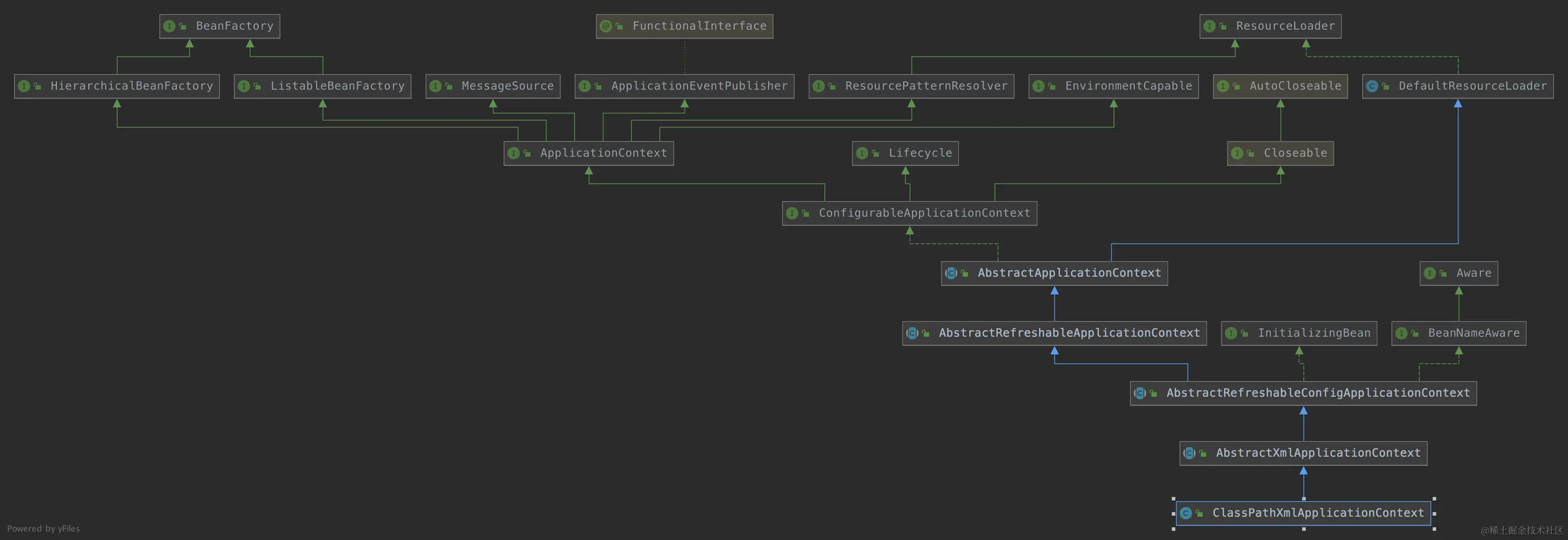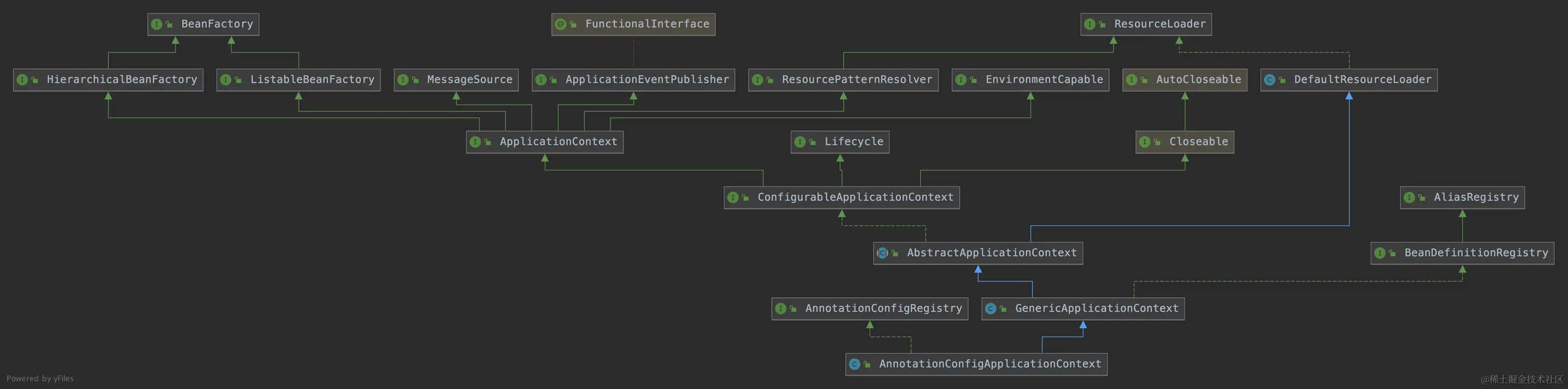 - AnnotationConfigApplicationContext:继承了GenericApplicationContext,实现了AnnotationConfigRegistry接口,拥有了以上所有的功能。