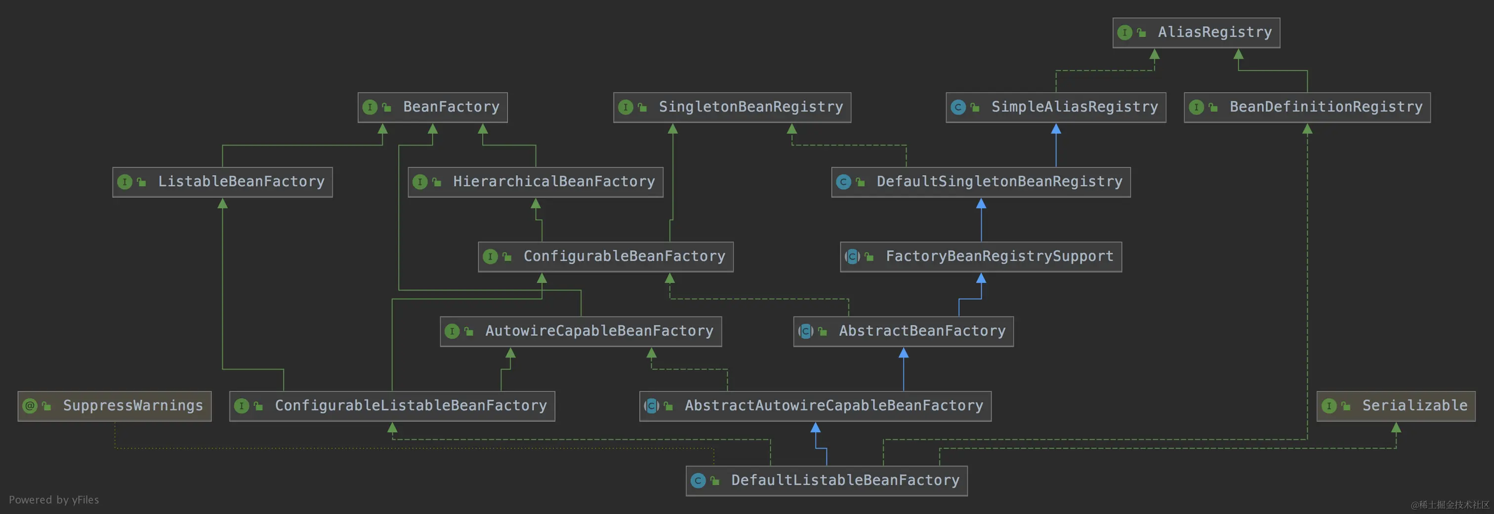 - AbstractBeanFactory:实现了ConfigurableBeanFactory接口,继承了FactoryBeanRegistrySupport,这个BeanFactory的功能已经很全面了,但是不能自动装配和获取beanNames