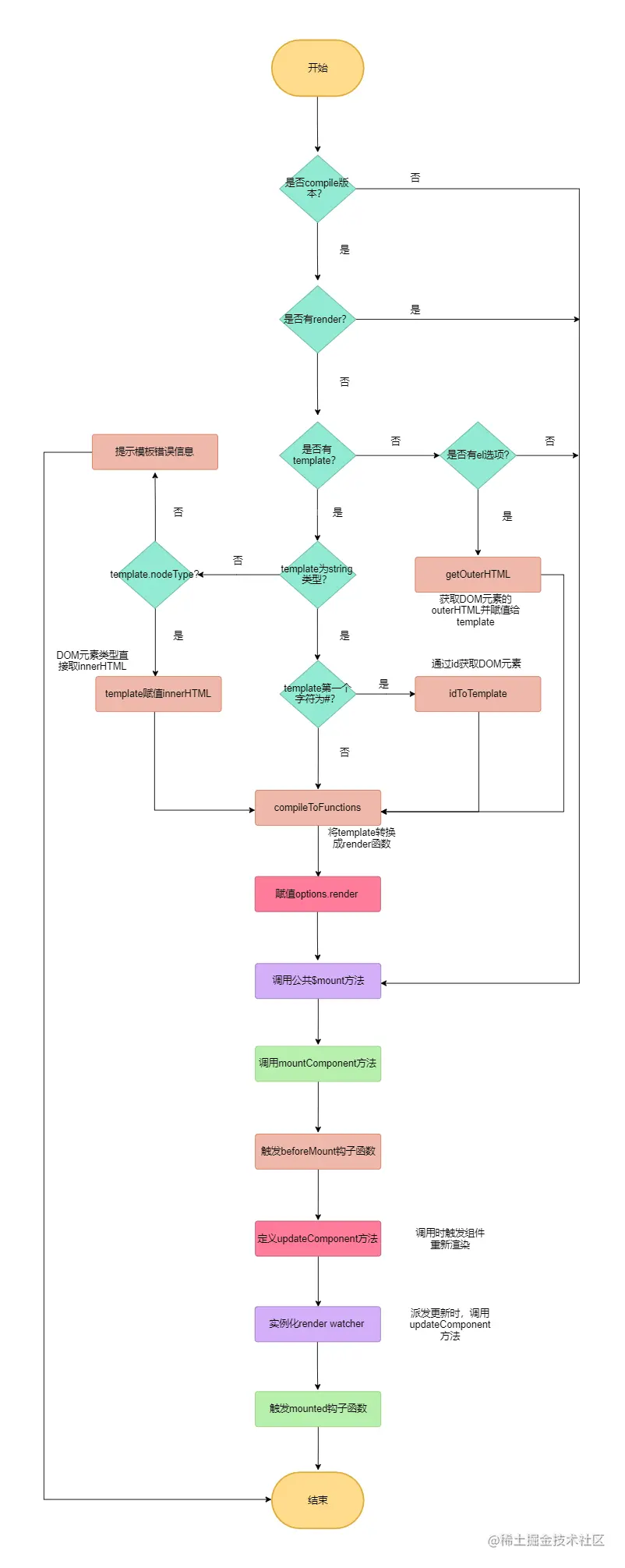 搞清楚了这两个$mount方法的区别后,我们接下来首先分析带compiler版本的$mount方法实现,它主要做三件事情:获取el元素、处理template和调用原始$mount方法,我们将根据这几个步骤来分别进行代码分析。