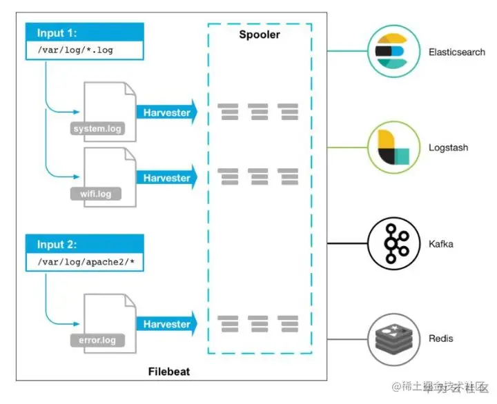 在 filebeat 的配置中,input_type 支持从Log、Syslog、Stdin、Redis、UDP、Docker、TCP、NetFlow 输入。上述配置了从 log 中读取日志信息。并且配置了只输入 /var/log/ 目录下的日志文件。output 将 Filebeat 配置为使用 logstash,并且使用 logstash 对 Filebeat 收集的数据执行额外的处理。