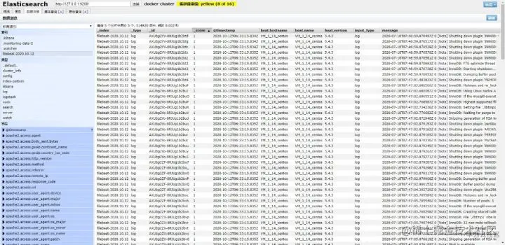 可以看到多了一个 filebeat-2020.10.12 的索引,说明 ELKB 分布式日志收集框架搭建成功。访问 http://localhost:9100,我们来具体看下索引的数据: