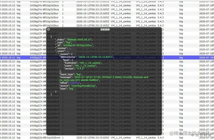 从上面两幅截图可以看到,/var/log/ 目录下的 mysqld.log 文件中产生了新的日志数据,这些数据非常多,我们在生产环境需要根据实际的业务进行过滤,并处理相应的日志格式。