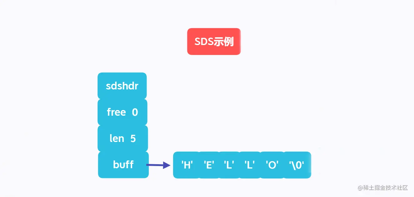 SDS简单动态字符串,是Redis的默认字符串,内部存储结构如下(buf不是指针,箭头仅代表buff数组存放的字符串):