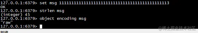 如果字符串对象保存的是一个字符串值,并且这个字符串大于44字节,那么字符串对象将使用SDS来保存这个字符串值,并将编码设置为raw。