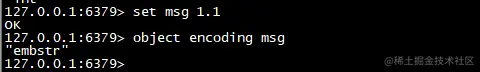 举例说明:set msg 1.1,redis会把浮点数当成字符串存储,当运算时会强转类型,计算后,再次转成字符串存储,截图如下: