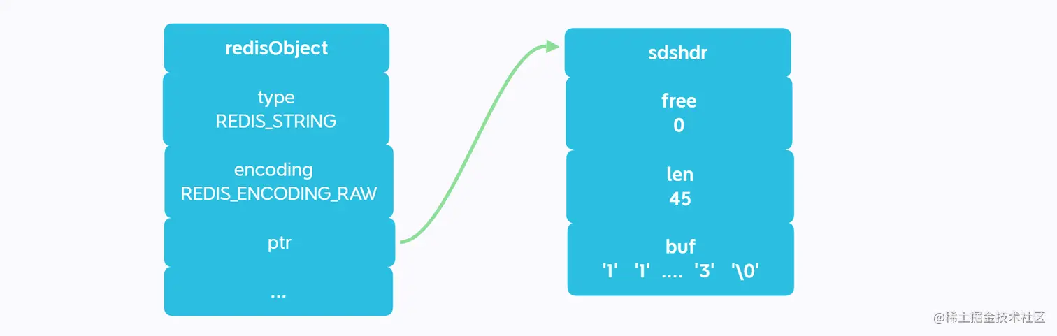 raw编码的字符串对象底层存储如下: