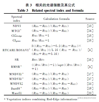 3 基于光谱特征分析建立的经验性光谱指数是目前反演叶绿素含量最常用的方法,可选取对植被叶绿素敏感度较高的光谱指数来反演作物叶绿素含量。计算12个常用叶绿素相关光谱指数。