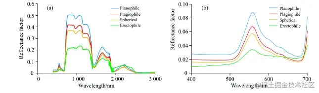 几乎所有波长的反射率都随着平均叶倾角的增大而减小,喜平型叶倾角分布的冠层反射率最高,而喜直型叶倾角分布对应的冠层反射率最低。(喜平型(Planophile)、喜斜型(Plagiophile)、球面型(Spherical)和喜直型(Erectophile))
