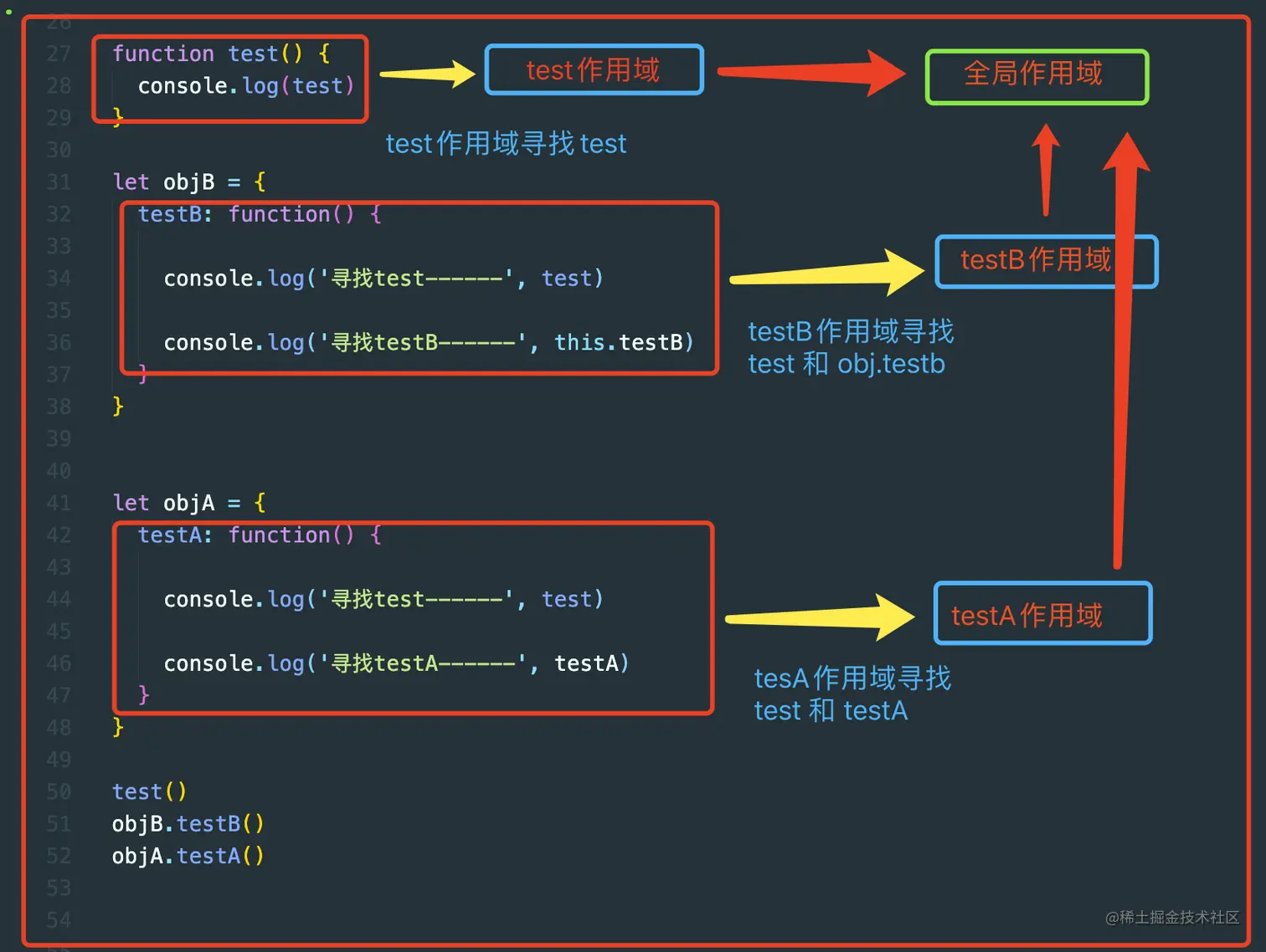 - testB() 调用后 会在自身的作用域中寻找 test 以及 objB.testB 属性 没有则去 全局作用域中寻找