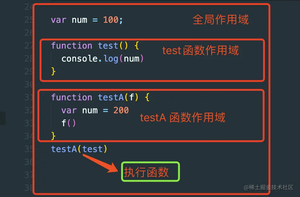 testA(test) // 100 作用域一旦确定不会更改