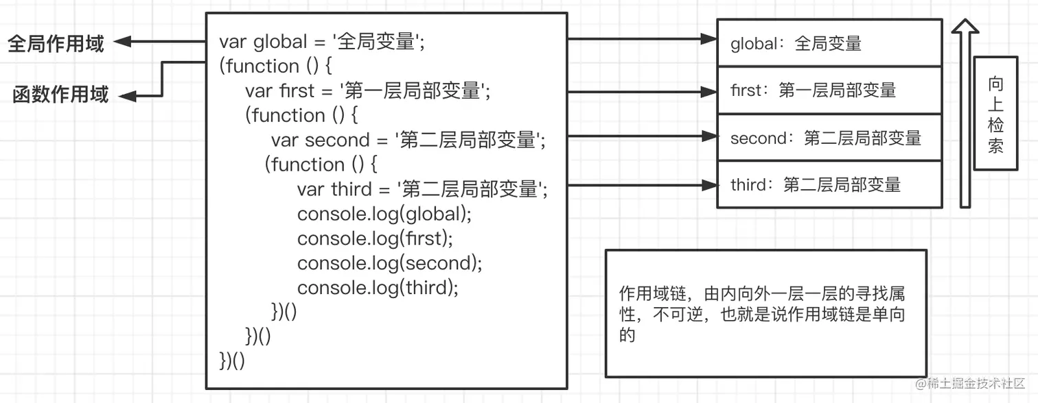 作用域表示变量的作用范围、可见区域,包括词法作用域和执行作用域。作用域规定了如何查找变量,也就是确定当前执行代码对变量的访问权限。JavaScript采用的是词法作用域,也称之为静态作用域。