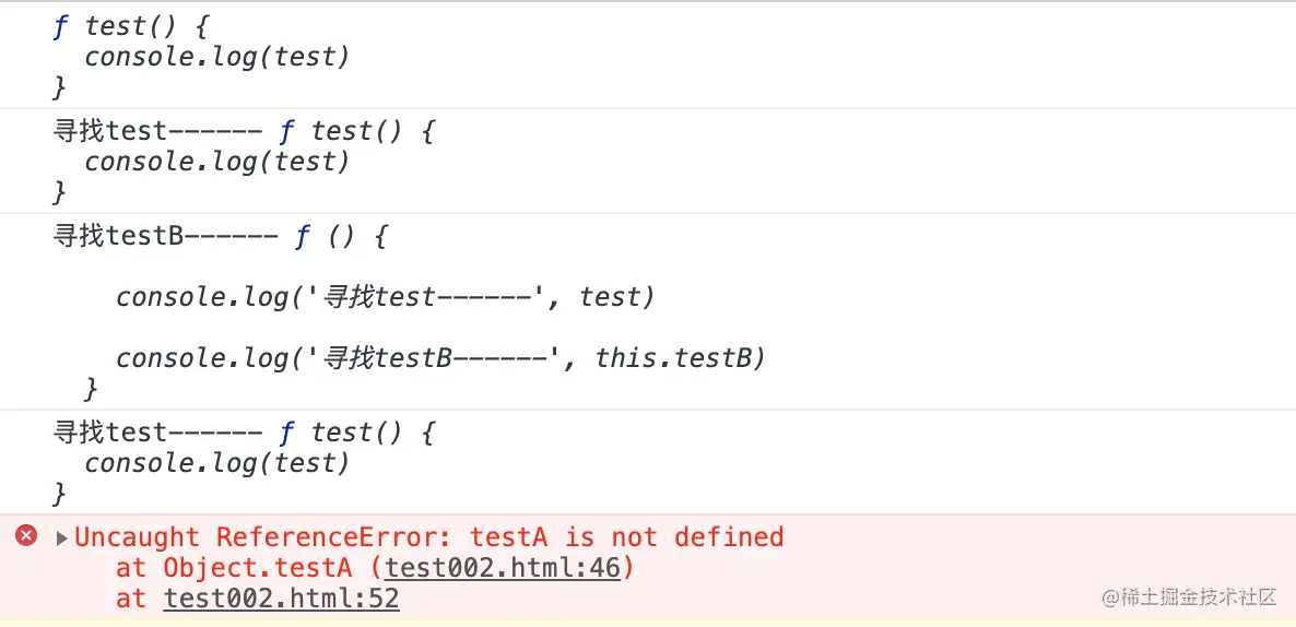 在这三个函数中均没有test属性,也没有 testA、objB.testB属性,所以均会在全局作用域中寻找,而全局作用域中拥有test属性以及bjB.testB属性,没有testA属性,所以在调用objA.testA()的时候会报错。