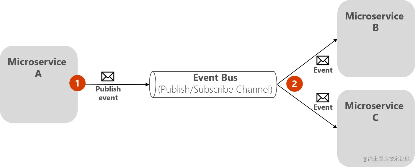 微服务 A 发布到事件总线,这会分发到订阅微服务 B 和 C,发布服务器无需知道订阅服务器。: