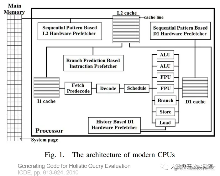 另外一张图解释了目前的CPU架构实现,L2 Cache和主存之间存在Hardware Pre-fetcher。L2 Cache分为指令Cache和Data Cache,指令Cache会由Branch Prediction实现分支预测,Data Cache会由基于Sequential Pattern的Pre-fetcher实现预测。因此,数据库系统的设计需要考虑该架构下如何充分发挥Pre-fetcher功能,让Cache可以不断为 CPU计算单元提供指令和数据,避免出现Cache Stall。