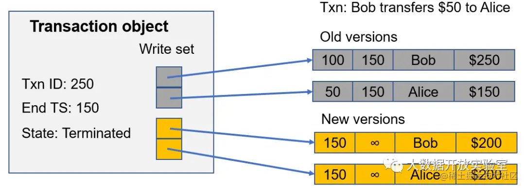 Hekaton中的回收任务并不由独立的线程处理,而是每个事务自己回收。如下图所示,Transaction ID为250的事务结束时间戳为150且状态为terminated,此时会有一个Write Set获取所有老版本,并判断当前所有active的Transaction的开始时间戳是否大于ID为250的事务结束时间,即150。如果都大于150,说明不可能再基于时间戳早于150的旧版本进行修改,因而由事务回收旧版本,这部分工作是每个线程在处理Transaction时的额外工作。