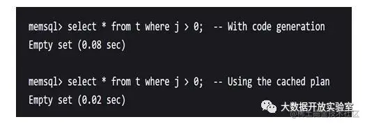 下图是一个对MemSQL性能的测试。没有采用编译执行时,MemSQL两次执行相同查询的时间都是0.05秒;如果采用编译执行,第一次耗时0.08秒,但是再执行时耗时仅0.02秒。