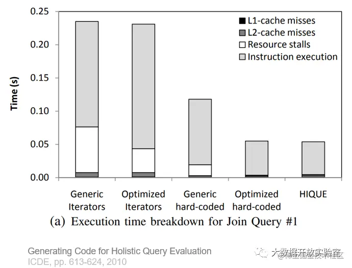 下图是对不同查询方式的耗时分析,可以看出编译执行方式中Resource Stall的占比很少。