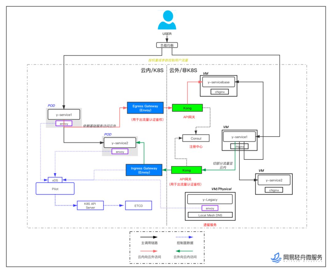 提供灰度引流能力,使基础架构及业务的迁移状态对调用方透明;这个过程需要处理好内部流量和外域流量