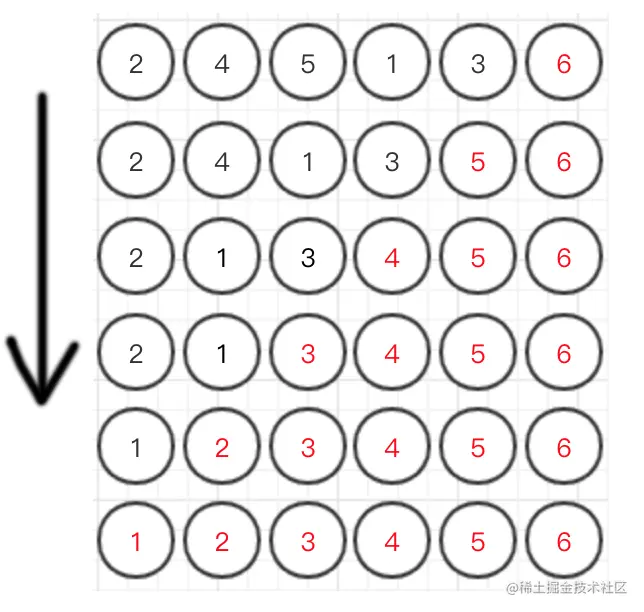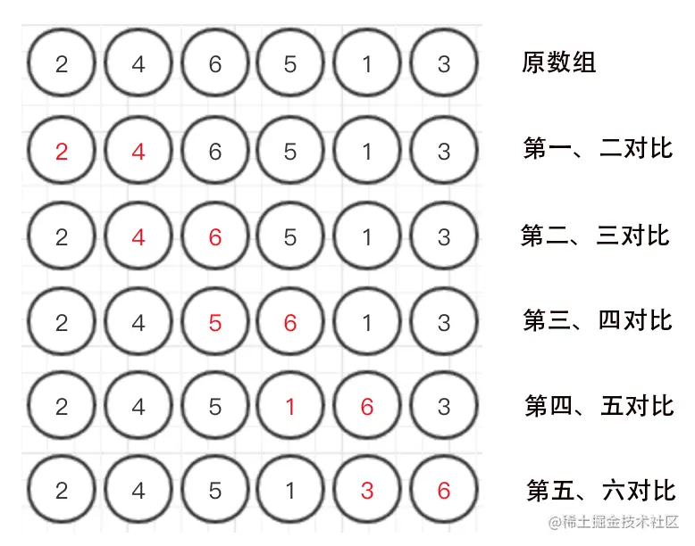 - 第一个数与第二个数对比,第一个数大于第一个数就调换,接着第二个数跟第三个数对比,第二个数大于第三个数就调换,如此类推到倒数第二个数。
