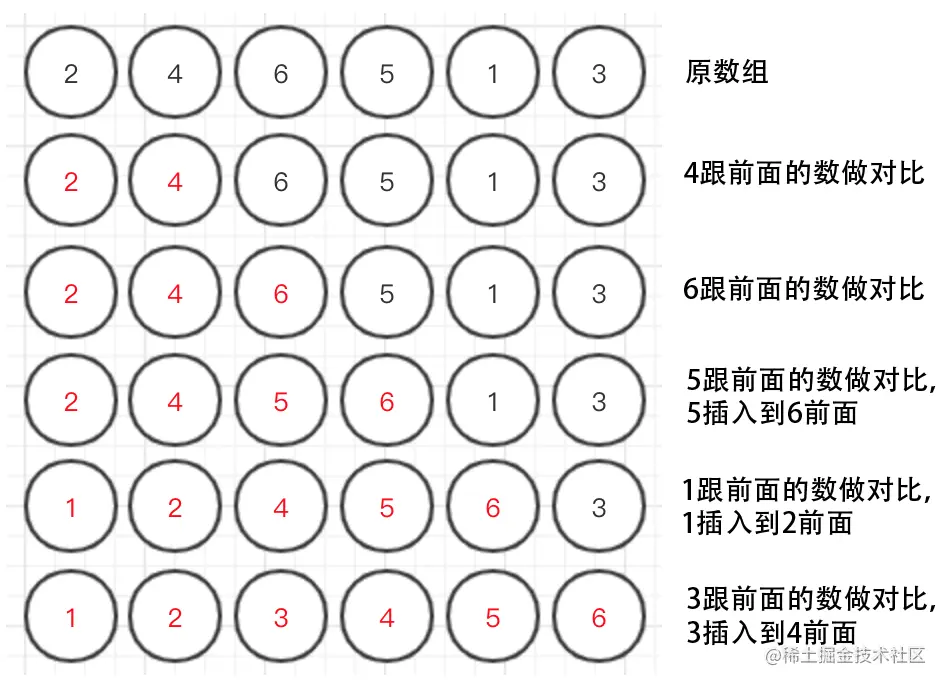- 从第二个数开始,第二个数跟第一个数做对比,插入到相应位置,接着第三个数跟第一、二个数对比,插入到相应位置,如此类推到最后一个数