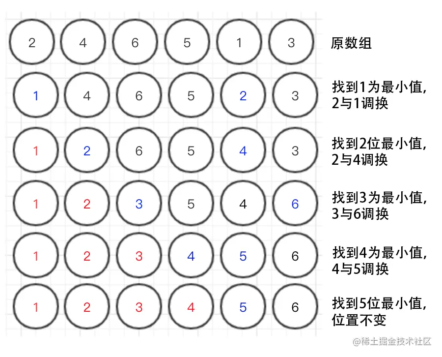 - 从第一位开始找到数组里面的最小值,与第一位的数调转