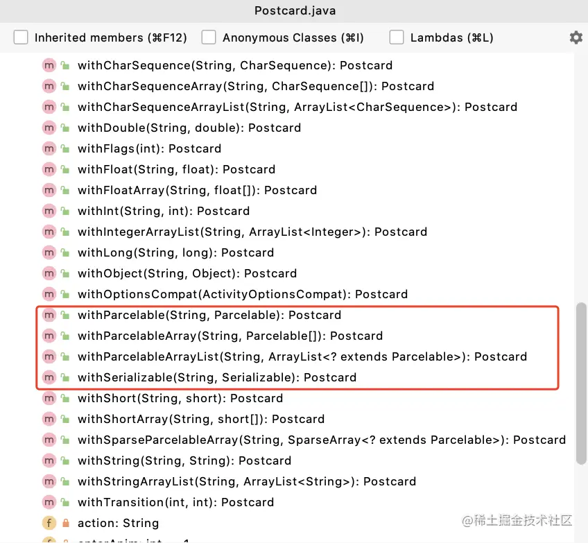 这里注意了在路由目标类里面定义接收list、map的时候,接收对象的地方不能标注具体的实现类类型,应仅标注为list或map,否则会影响序列化中类型的判断,其他类似情况需要同样处理 其他几种序列化的方式也带了,大家自行查看postCard的with** 相关方法: