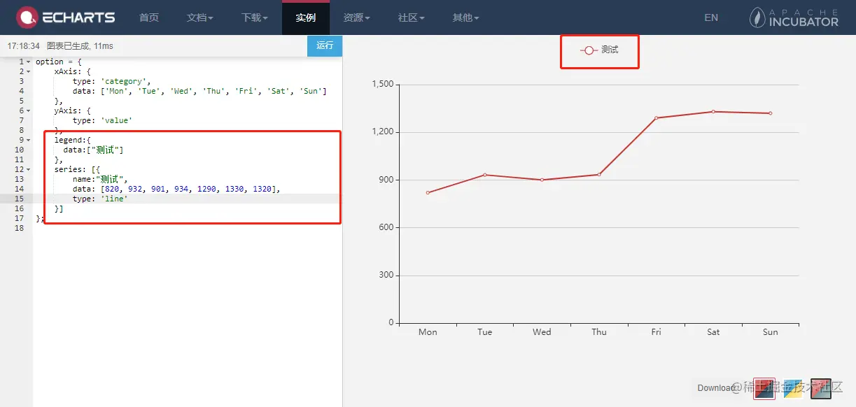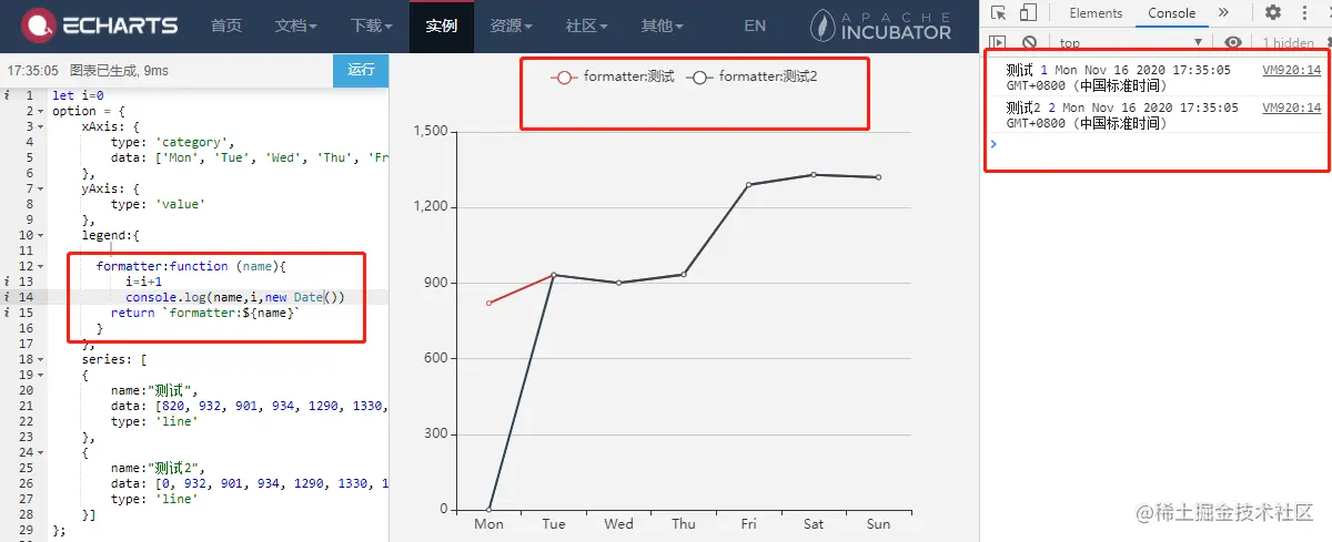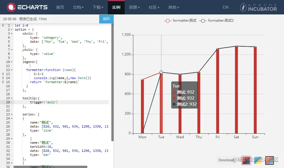 option = { xAxis: { type: 'category', data: ['Mon', 'Tue', 'Wed', 'Thu', 'Fri', 'Sat', 'Sun'] }, yAxis: { type: 'value' }, legend:{ //函数表达 formatter:function (name){ //这个用的模版字符串 return `formatter:${name}` } //formatter的string来进行规范的话就这么写 formatter:'formatter string{value}' }, series: [ { name:"测试", data: [820, 932, 901, 934, 1290, 1330, 1320], type: 'line' }, { name:"测试2", data: [0, 932, 901, 934, 1290, 1330, 1320], type: 'line' }]};