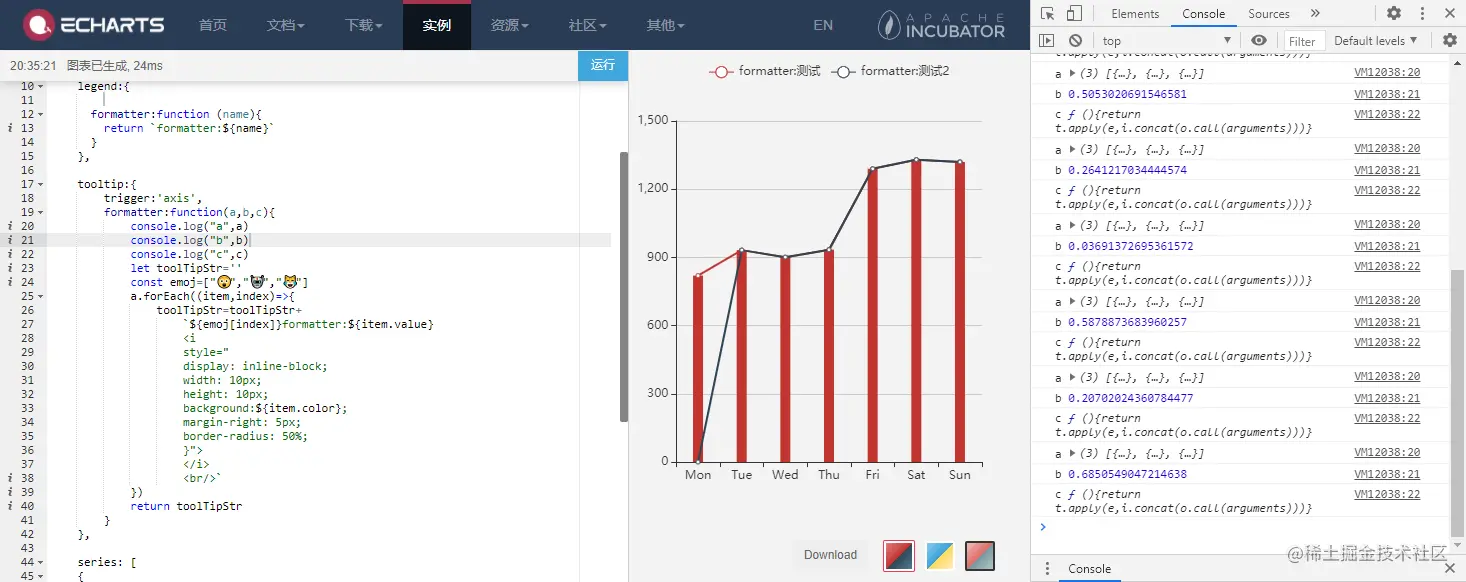 tooltip:{ trigger:'axis', formatter:function(a,b,c){ //这里的abc可以改名的,它是说有三个参数,第一个是series,第二是类目值,第三个是一个函数,可以改的 console.log("a",a) console.log("b",b) console.log("c",c) let toolTipStr='' const emoj=["😲","🤖","😹"] a.forEach((item,index)=>{ toolTipStr=toolTipStr+ `${emoj[index]}formatter:${item.value} <i style=" display: inline-block; width: 10px; height: 10px; background:${item.color}; margin-right: 5px; border-radius: 50%; }"> </i> <br/>` }) return toolTipStr } },