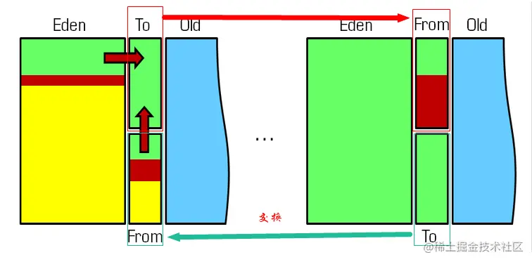 ④、经过这次GC后,Eden区和From区已经被清空。这个时候, 「From和To」 会交换它们的角色,也就是新的 「To」 就是上次GC前的 「From」,新的 「From」 就是上次GC前的 「To」 。