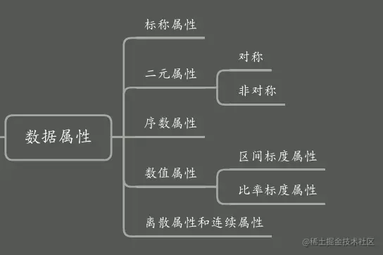 ❝属性就是数据的一个字段,表示数据对象的一个特征,如性别,年龄。有过面向对象的编程的经验的人看到这个第一反应可能就是一条数据就是一个对象,数据的属性就是对象的属性,属性的分类如下图所示