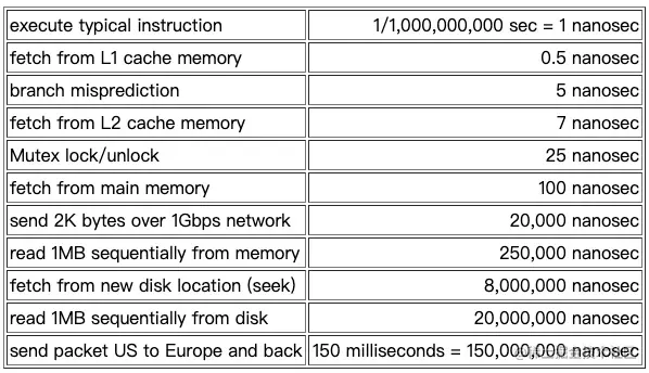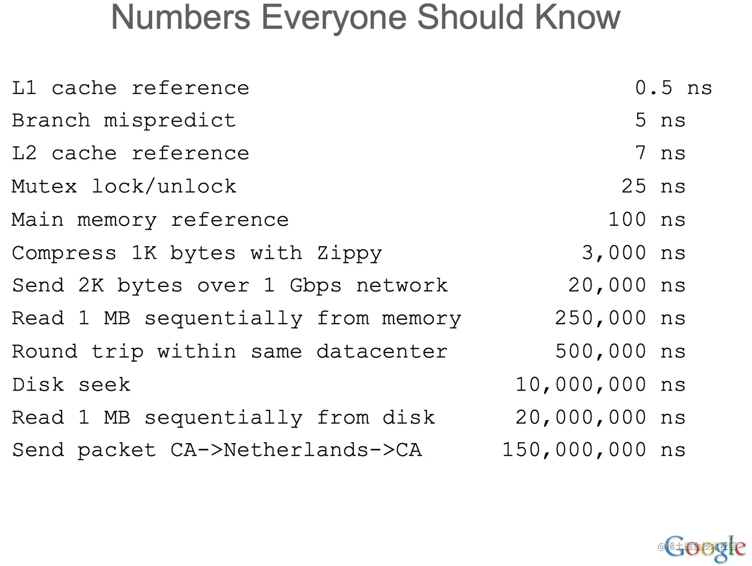 Jeff Dean 在他关于分布式系统的 ppt 中列出了“每个程序员都应该了解的数字(Numbers Everyone Should Know)”,对计算机各类操作的耗时做了大致估计。这些数字在很多地方都很有用。
