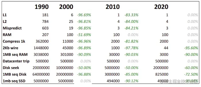 对于今天的数字,伯克利大学有个动态网页,可以查看每年各个操作耗时的变化,根据网页的数据,总结每 10 年来的变化如下图: