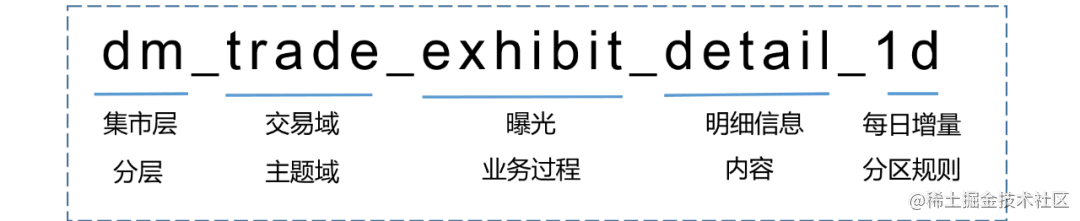 另外,各层的数据表都会采用统一的命名规则进行规范化管理,表名中会携带分层、主题域、业务过程以及分区信息。比如,对于交易域下的一张曝光表,命名可以是这样: