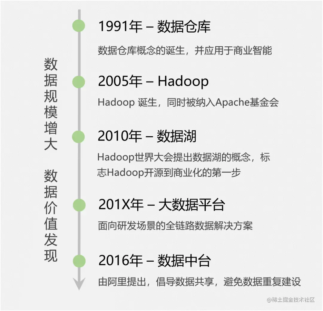 在解释「大数据」这个概念之前,先带大家了解下大数据将近30年的发展历史,共经历了5个阶段。那在每个阶段中,大数据的历史定位是怎样的?又遇到了哪些痛点呢?