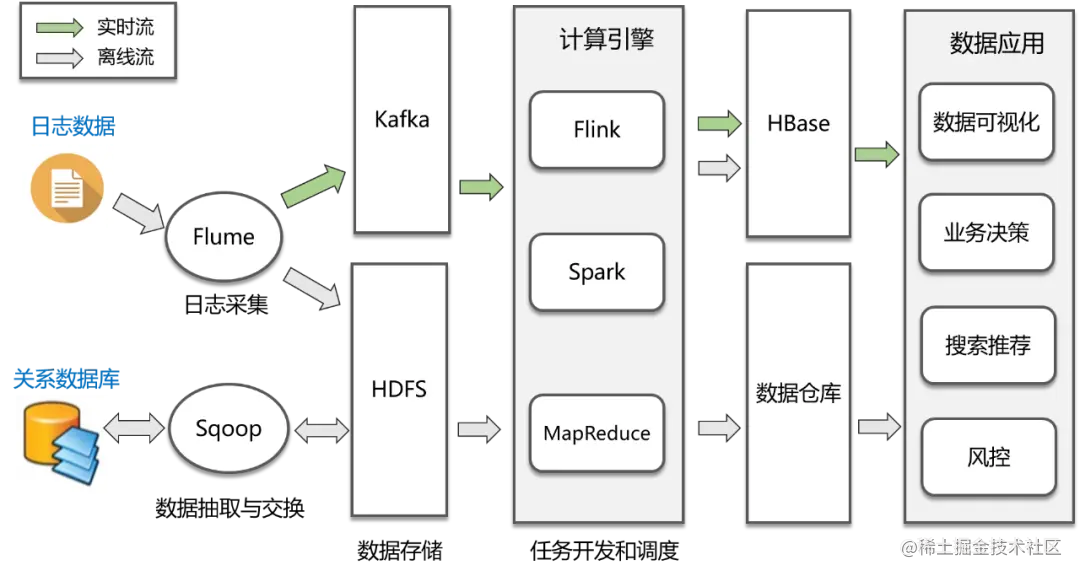 - 数据采集:这是大数据处理的第一步,数据来源主要是两类,第一类是各个业务系统的关系数据库,通过Sqoop或者Cannal等工具进行定时抽取或者实时同步;第二类是各种埋点日志,通过Flume进行实时收集。