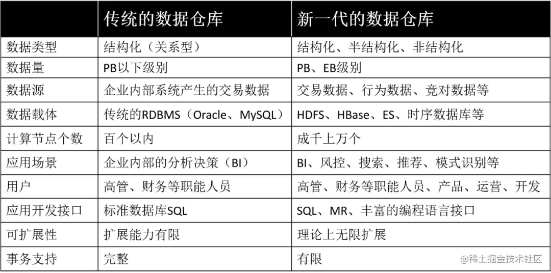 随着大数据时代的到来,传统数据仓库和新一代数据仓库必然有很多不同,下面从多维度对比下两代数据仓库的异同。