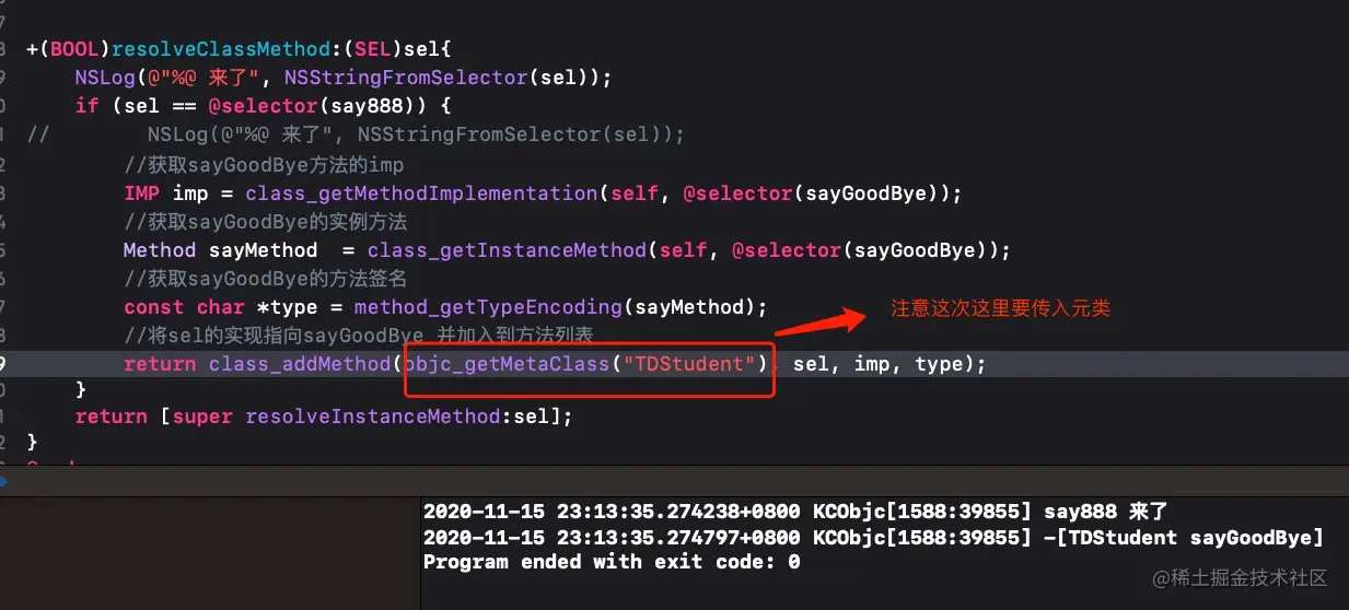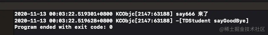 此时我们在看控制台的打印信息+(BOOL)resolveInstanceMethod:(SEL)sel{ if (sel == @selector(say666)) { NSLog(@"%@ 来了", NSStringFromSelector(sel)); //获取sayGoodBye方法的imp IMP imp = class_getMethodImplementation(self, @selector(sayGoodBye)); //获取sayGoodBye的实例方法 Method sayMethod = class_getInstanceMethod(self, @selector(sayGoodBye)); //获取sayGoodBye的方法签名 const char *type = method_getTypeEncoding(sayMethod); //将sel的实现指向sayGoodBye 并加入到方法列表 return class_addMethod(self, sel, imp, type); } return [super resolveInstanceMethod:sel]; } - 关于类方法的处理