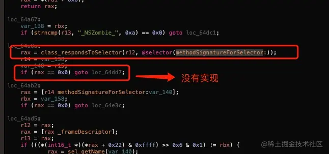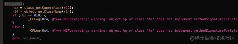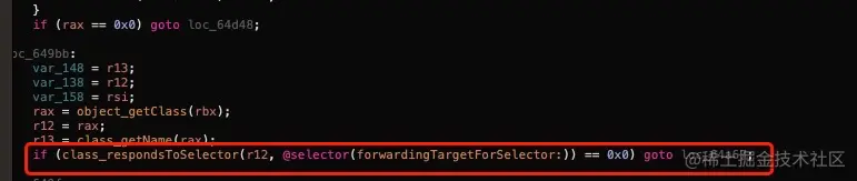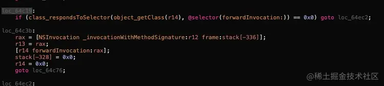forwardingTargetForSelector方法有没有实现,如果没有实现就跳到loc_64a67(慢速转发)有实现但是返回值是nil的时候直接报错然后再判断